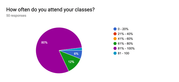 We can see that 80% of surveyed students attend almost all classes. However, there are some students who do not attend all of their classes.
